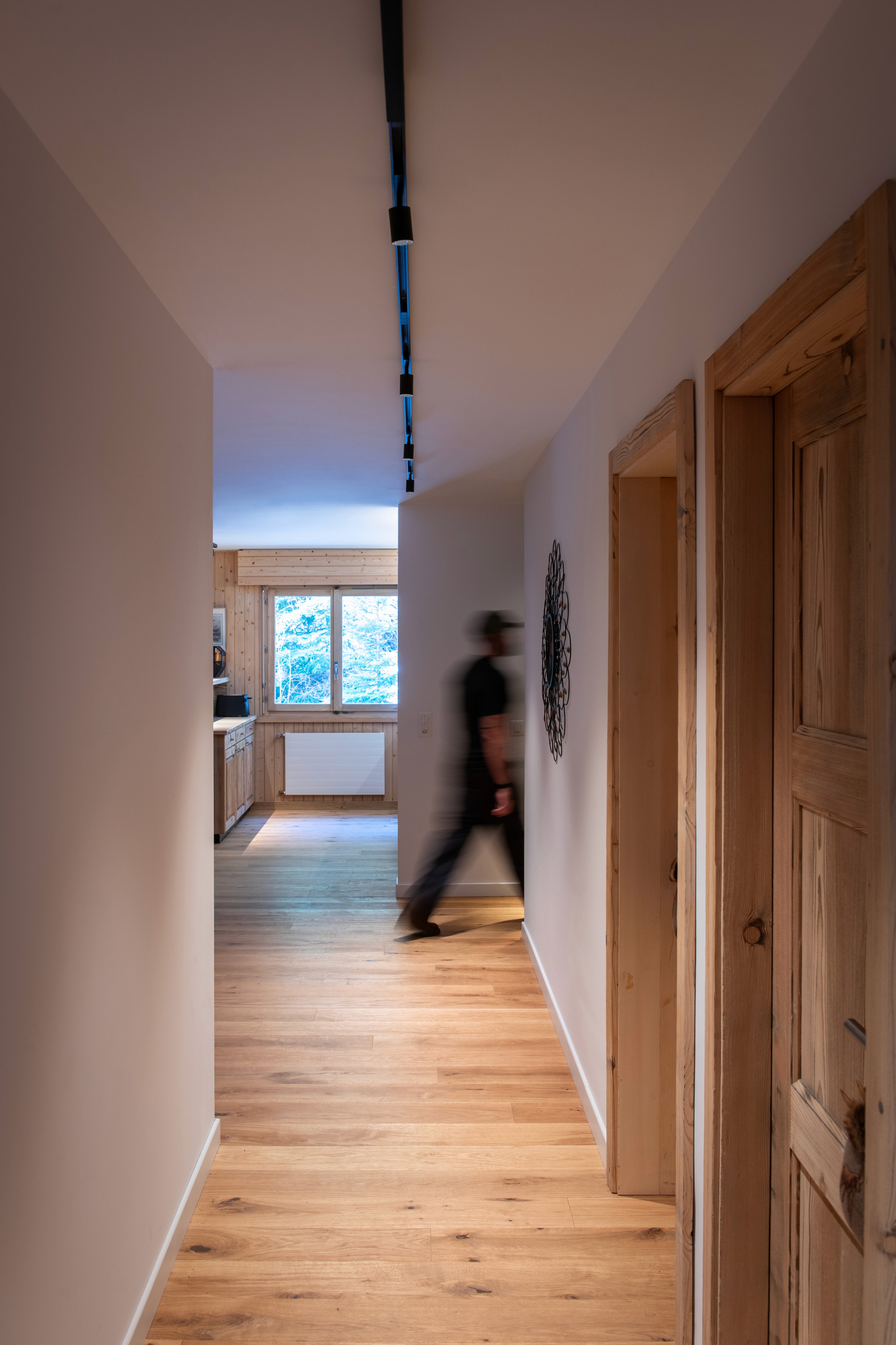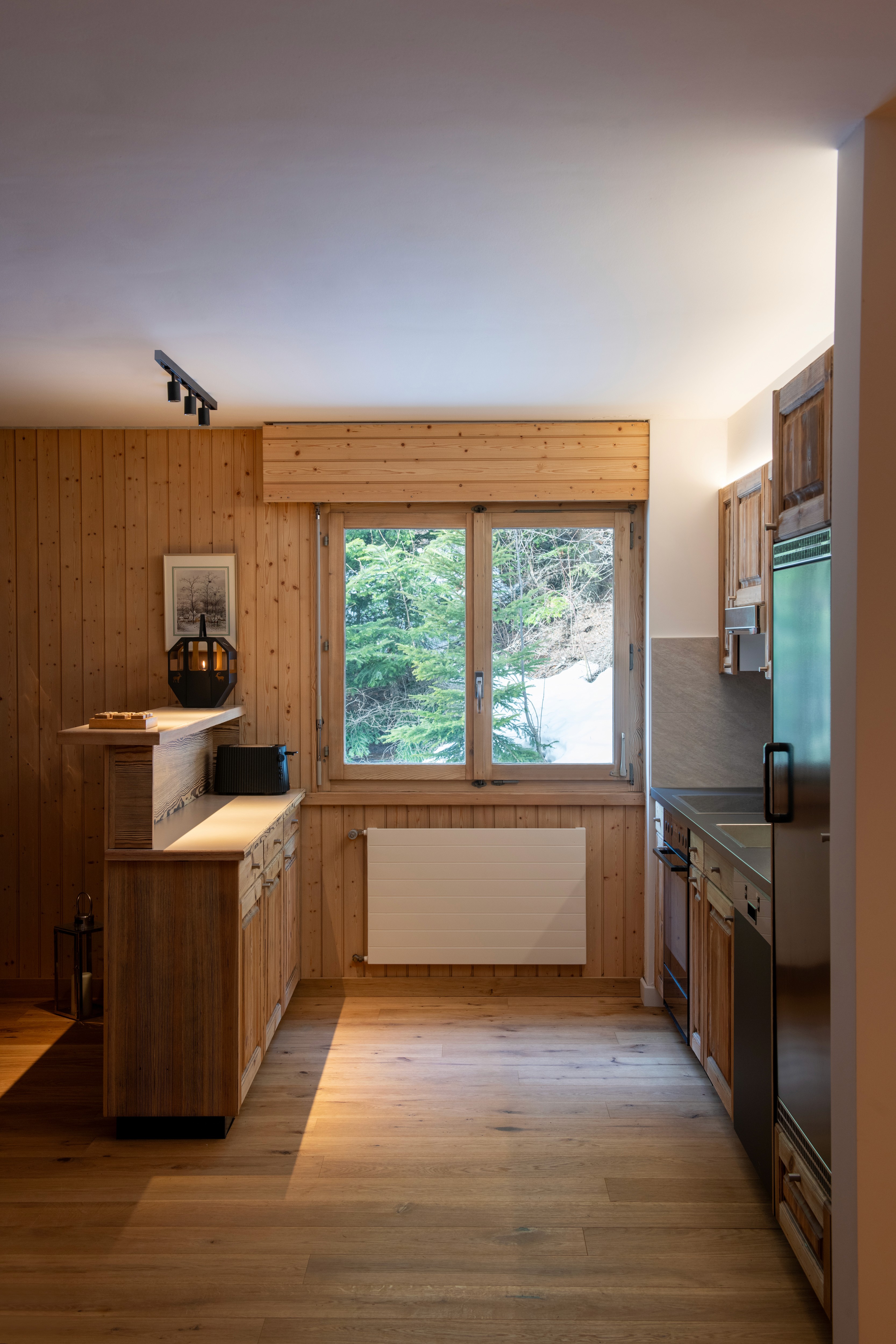 Warm color temperatures and carefully controlled contrasts were used to create a cozy, welcoming atmosphere throughout the living spaces while maintaining clarity and visual comfort in functional areas such as the kitchen and bathrooms. Indirect lighting was integrated within architectural details to reinforce the chalet’s calm, refined aesthetic while preserving the serenity of the alpine surroundings.